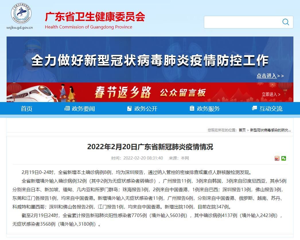 荔枝新闻讯 据广东省卫健委消息,2月19日0-24时,广东全省新增本土确诊病例8例,均为深圳报告,通过纳入管控的密接排查或重点人群核酸检测发现。