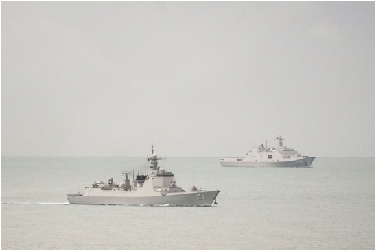 首先,图片显示,中国海军的052D型导弹驱逐舰合肥舰(舷号174)和071型两栖船坞登陆舰井冈山舰(舷号999)当时正在国际水域航行。中国国防部新闻发言人吴谦大校此前曾多次回应称,在非领海海域,中国军队舰机和其他国家舰机一样,都享有航行自由的权利。
