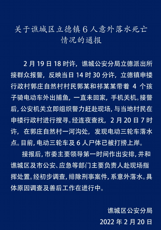 荔枝新闻讯 2月19日18时许,安徽谯城公安分局立德派出所接群众报警,反映当日14时30分许,立德镇申楼行政村郭庄自然村村民郭某和祁某某带着4个孩子骑电动车外出捕鱼,一直未回家,手机关机。接警后,公安机关立即组织警力赶赴现场,与当地村民在申楼行政村进行搜寻。经连夜查找,2月20日7时许,在郭庄自然村一河沟处,发现电动三轮车落水点。目前,电动三轮车及6人尸体已被打捞上岸。