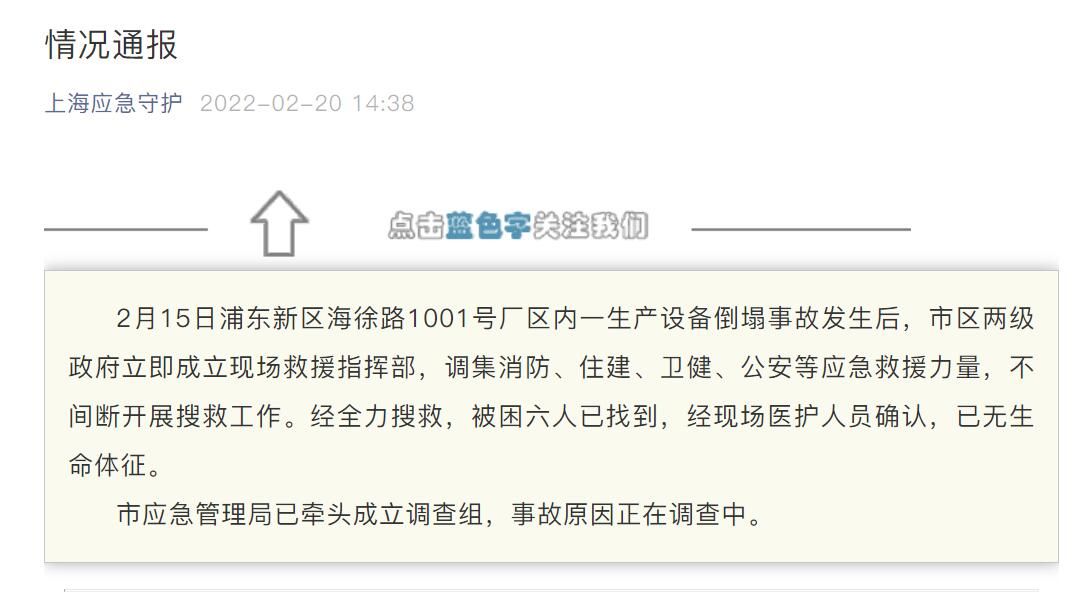 荔枝新闻讯 据上海市应急管理局官方公众号2月20日消息,2月15日浦东新区海徐路1001号厂区内一生产设备倒塌事故发生后,市区两级政府立即成立现场救援指挥部,调集消防、住建、卫健、公安等应急救援力量,不间断开展搜救工作。经全力搜救,被困六人已找到,经现场医护人员确认,已无生命体征。