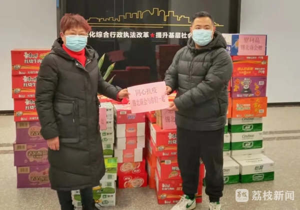 锡北商会向锡北镇捐赠八宝粥、方便面、矿泉水等物资。