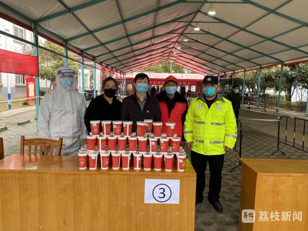 羊尖镇廊下村村民为在一线的志愿者和工作人员送上暖心奶茶。