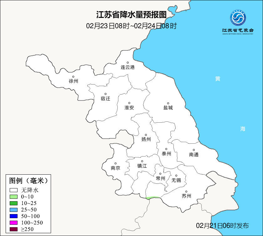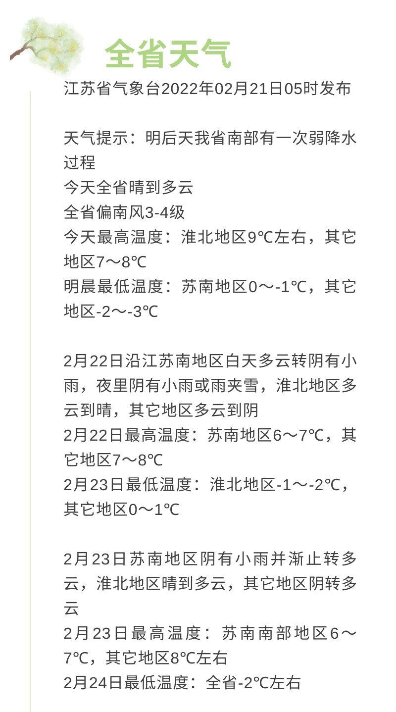 据江苏省气象台,今天(21日)全省晴到多云,全省偏南风3-4级,今天最高温度:淮北地区9℃左右,其它地区7~8℃,明晨最低温度:苏南地区0~-1℃,其它地区-2~-3℃。