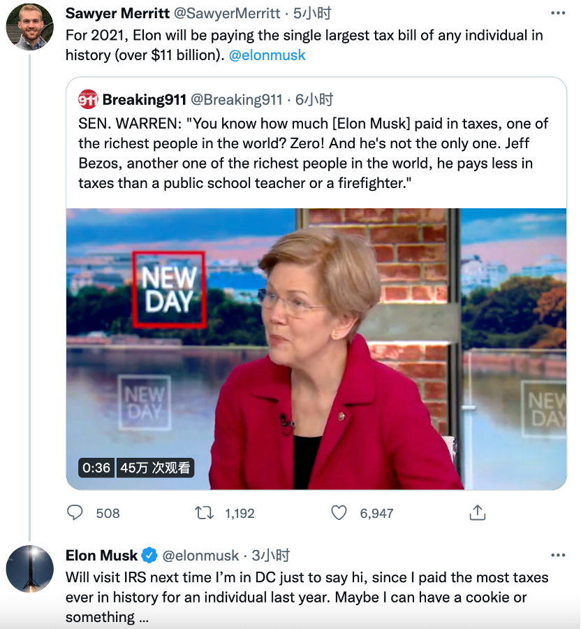 特斯拉投资人Sawyer Merritt在推特上转发了一段美国民主党参议员伊丽莎白·沃伦(Elizabeth Warren)的抨击马斯克去年根本没有纳税的采访,并配文表示,马斯克在2021年缴税超110亿美元,是历史上纳税额最高的个人。