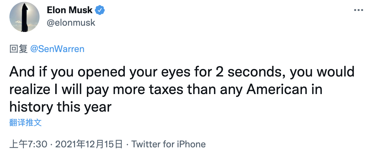 随后马斯克在推特上回应表示,他2021年缴纳税款额超110亿美元,将成为历史之最,“只需睁开眼睛2秒钟,就能知道我今年的纳税金额将超过历史上任何一个美国人。”