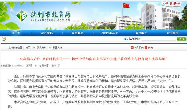 今天记者从扬州市教育局了解到,近日,江苏省扬州中学与南京大学签约共建“教育博士与教育硕士实践基地”。