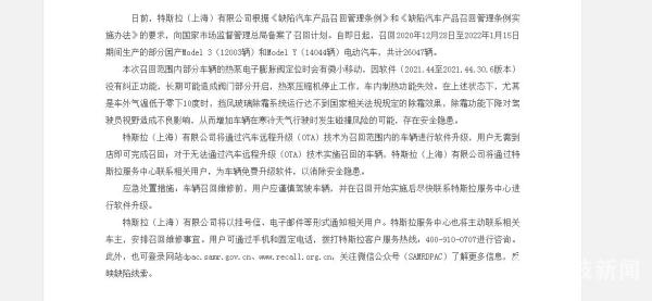 本次召回共涉及国产特斯拉Model3 12003辆、Model Y 14044辆,召回范围内部分车辆的热泵电子膨胀阀定位时会有微小移动,因软件没有纠正功能,长期可能造成阀门部分开启,热泵压缩机停止工作,车内制热功能失效。在上述状态下,尤其是车外气温低于零下10摄氏度时,挡风玻璃除霜系统运行达不到国家相关法规规定的除霜效果,而除霜功能下降对驾驶员视野造成不良影响,从而增加车辆在寒冷天气行驶时发生碰撞风险的可能,存在一定的安全隐患。南京东麒路特斯拉中心工作人员表示,本次召回针对的事故空调系统冷凝管,属于网上召回,主要是对车辆软件进行更新。