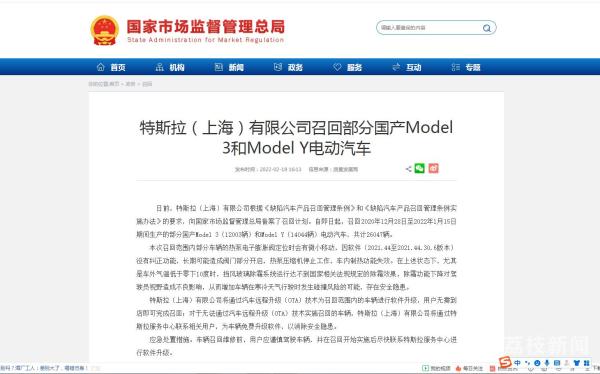 国家市场监督管理总局2月18日公告,特斯拉(上海)有限公司根据《缺陷汽车产品召回管理条例》和《缺陷汽车产品召回管理条例实施办法》的要求,自即日起,召回2020年12月28日至2022年1月15日期间生产的部分国产Model 3和Model Y电动汽车。
