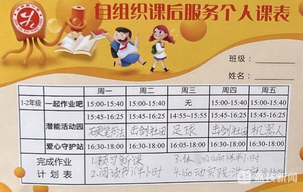 在南京市中央路小学,三年级(3)班的学生童千窈向记者展示了她刚刚收到的一份“课后服务个人课表”。上面写着每天三个阶段课后服务的时间和社团课的具体内容,还附带一栏“完成作业计划表”,可以自行制定学习、锻炼、劳动等各项计划。