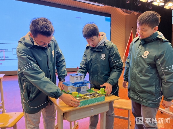 在学校的学生剧场,初三(18)班的学生轮流上台,展示自己综合实践活动“电磁继电器应用”的作品,有磁悬浮列车、烟雾报警器、防盗报警器、温度报警器、水位报警器等。这次活动也是一次预演,他们不久后还会在江苏省基础教育前瞻性教学改革重大项目的一次物理学科会议上正式展出这些作品。
