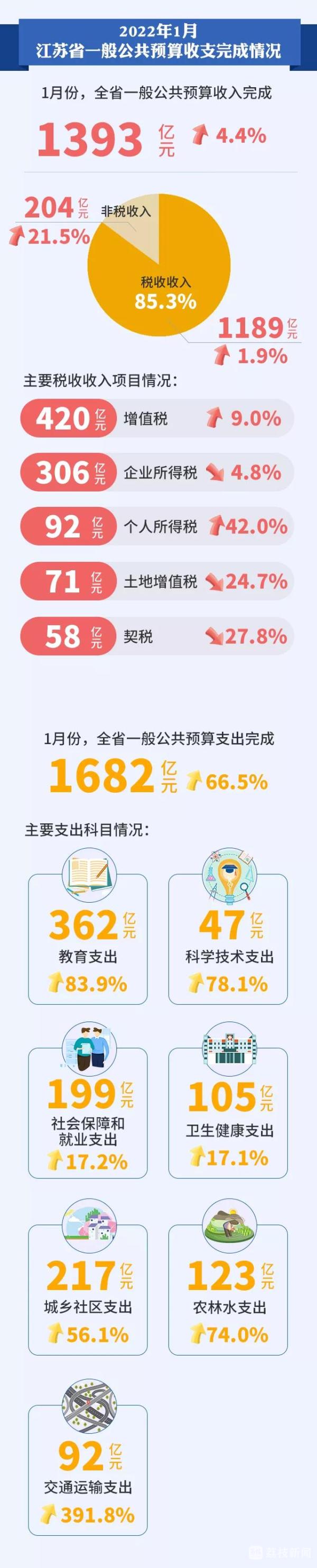 记着今天获悉,1月份,全省一般公共预算收入完成1393亿元,增长4.4%。其中,税收收入完成1189亿元,增长1.9%;非税收入完成204亿元,增长21.5%。全省税收占比为85.3%。其中增值税420亿元,增长9.0%。企业所得税306亿元,下降4.8%。 个人所得税92亿元,增长42.0%。