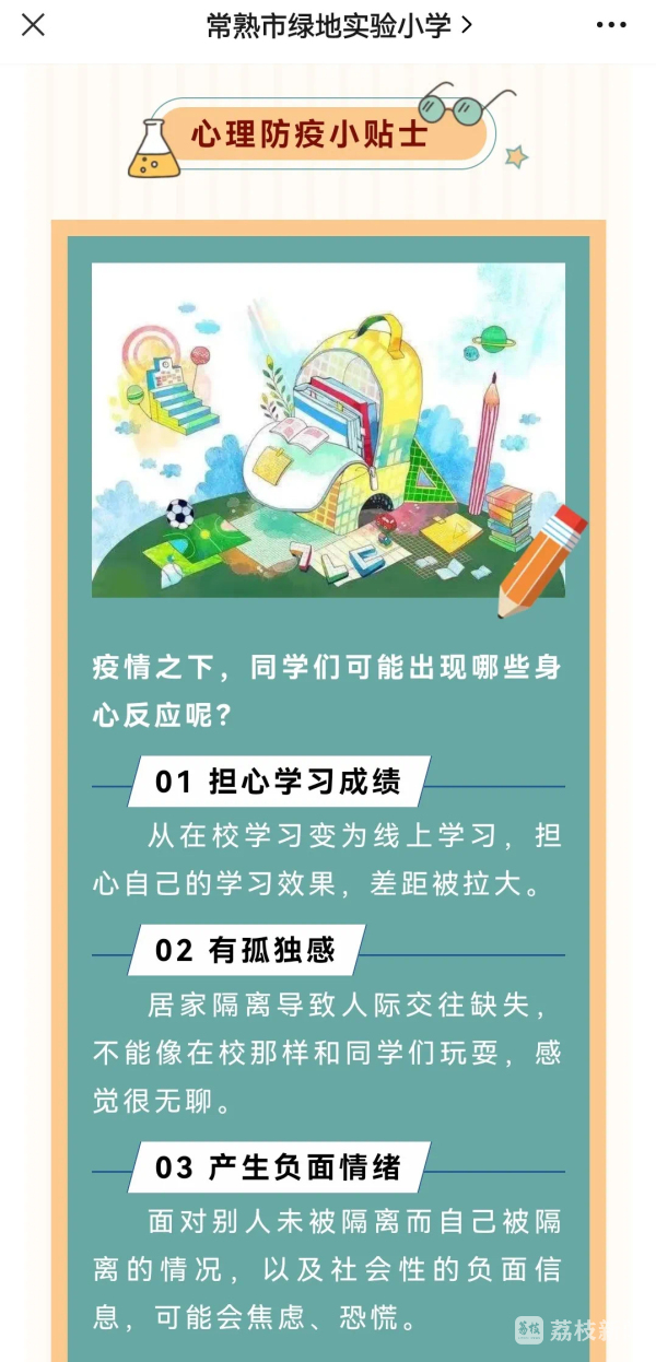 常熟市绿地实验小学加强家校联系和心理健康教育,在微信公众平台推送心理专题内容,为疫情期间的学生和家长提供了自我调节、改善情绪的心理防疫“小贴士”,指导学生尝试使用“SETC”法调整情绪,欢迎学生和家长有困惑时拨打心理辅导热线电话,帮助学生迅速调整,以积极的身心状态投入线上学习。