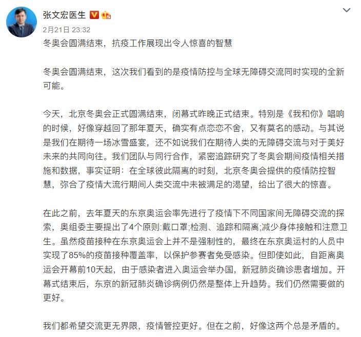 荔枝新闻讯 2月21日深夜,上海复旦大学附属华山医院感染科主任张文宏医生在其微博上发文称“冬奥会圆满结束,抗疫工作展现出令人惊喜的智慧”。全文如下: