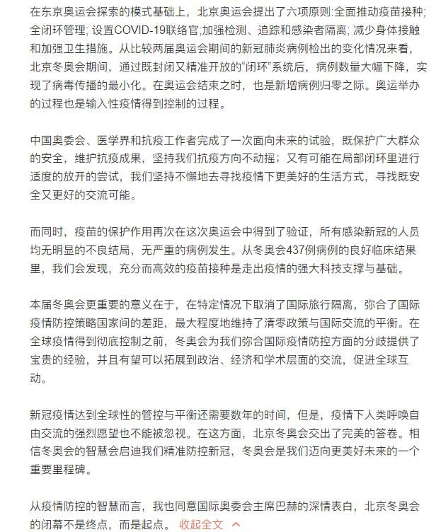 从疫情防控的智慧而言,我也同意国际奥委会主席巴赫的深情表白,北京冬奥会的闭幕不是终点,而是起点。