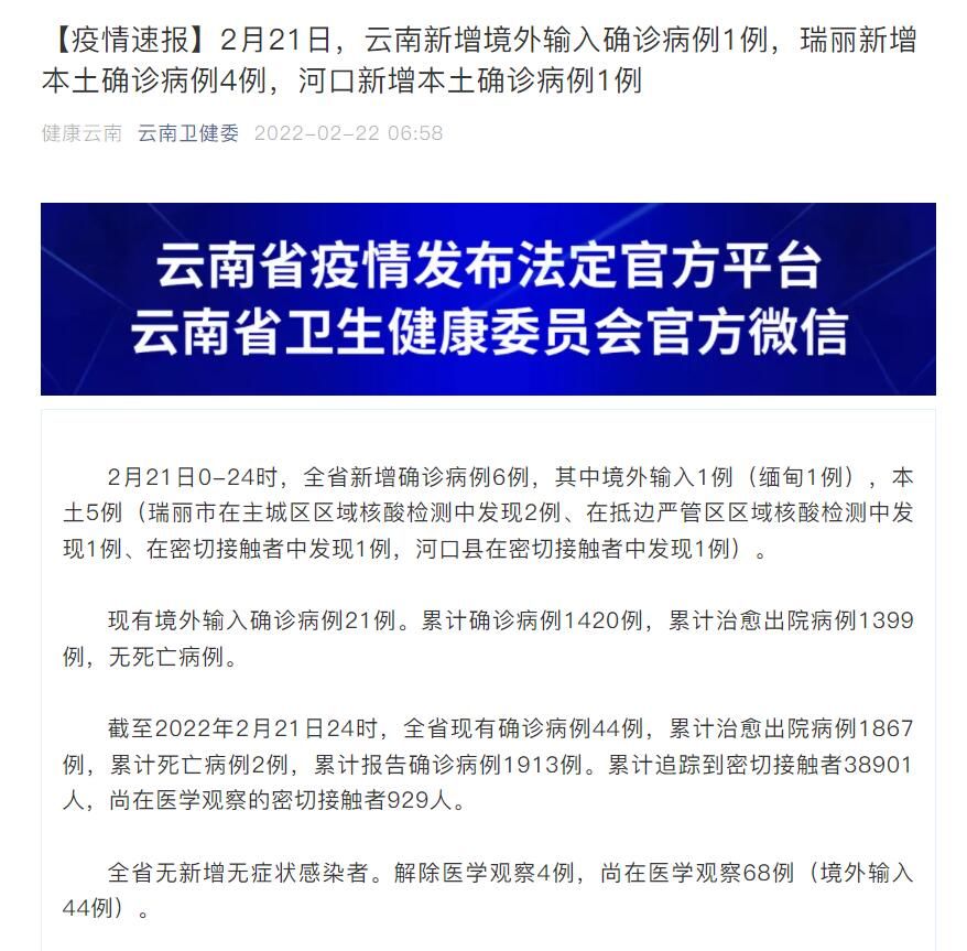荔枝新闻讯 据云南省卫健委消息,2月21日0—24时,云南省新增确诊病例6例,其中境外输入1例(缅甸1例),本土5例(瑞丽市在主城区区域核酸检测中发现2例、在抵边严管区区域核酸检测中发现1例、在密切接触者中发现1例,河口县在密切接触者中发现1例)。