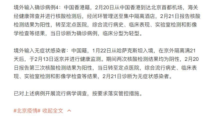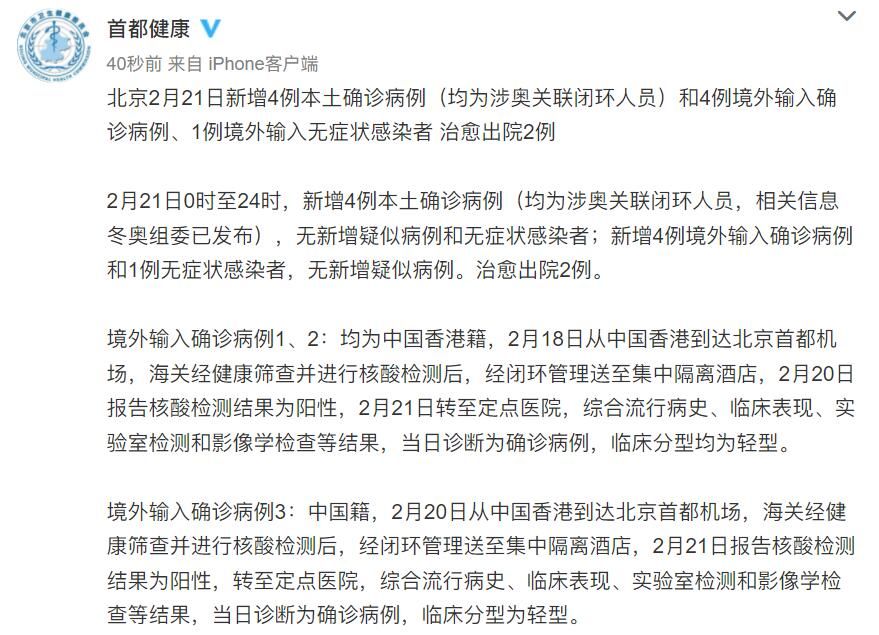 荔枝新闻讯 据北京市卫生健康委员会官方微博消息,2月21日0时至24时,北京新增4例本土确诊病例(均为涉奥关联闭环人员,相关信息冬奥组委已发布),无新增疑似病例和无症状感染者;新增4例境外输入确诊病例和1例无症状感染者,无新增疑似病例。治愈出院2例。