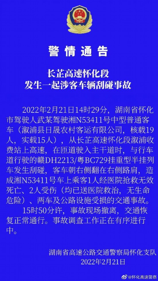 记者从湖南省高速公路交通警察局怀化支队了解到,2月21日14时29分,湖南省怀化市驾驶人武某驾驶中型普通客车(溆浦县日晟农村客运有限公司,核载19人,实载15人),从长芷高速怀化段溆浦收费站上高速,在匝道驶入主干道时,与行车道行驶的挂重型半挂列车发生剐碰,客车朝右侧翻在右侧路肩,造成客车车上乘客1人经医院抢救无效死亡、2人受伤(均已送医院救治,无生命危险)、两车及公路设施受损的交通事故。