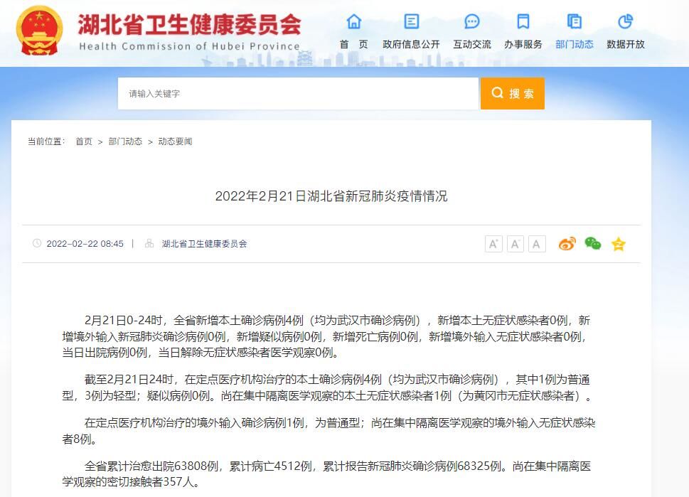 截至2月21日24时,在定点医疗机构治疗的本土确诊病例4例(均为武汉市确诊病例),其中1例为普通型,3例为轻型;疑似病例0例。尚在集中隔离医学观察的本土无症状感染者1例(为黄冈市无症状感染者)。