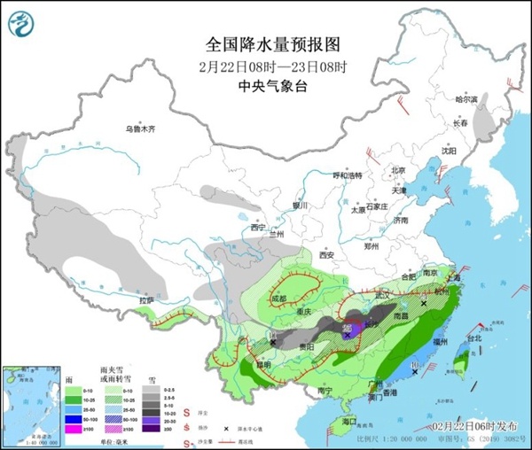 今天(2月22日),南方大部地区仍有大范围阴雨雪天气,雨雪分界线将进一步南压至今冬最南端,贵州、湖南等地都将出现纯雪。明天起,南方降水范围将迅速收缩,多地阳光有望“露脸”,气温逐步回升,华南大部最高气温将回升至两位数。