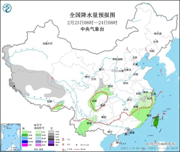 今天,南方仍有大范围的雨雪天气,且雪线还将继续南压,可达贵州、湖南南部一带,接近今冬以来的最南端。中央气象台预计,吉林东部、新疆南疆盆地西部山区、西藏西部和东南部、青海东南部、甘肃南部、陕西西南部、川西高原、云南西北部和东北部、贵州、湖北南部、江南北部等地部分地区有小到中雪或雨夹雪,其中,云南东北部、贵州中北部、湖南中部、江西北部等地部分地区有大到暴雪,局地大暴雪(20~25毫米)。江南中东部和南部、云南中南部、贵州南部、华南、海南岛、台湾岛等地部分地区有小到中雨,其中,福建东部、广东东部、台湾岛北部等地部分地区有大雨(25~40毫米)。
