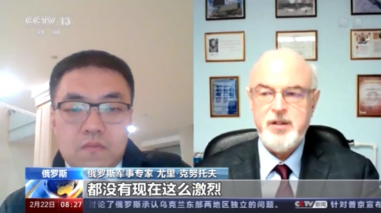 俄罗斯军事专家 尤里·克努托夫:考虑到我们边境附近已经有战事发生,我们加强了我们在边境沿线的军事部署。(卢甘斯克)能听到接连不断的射击,他们(卢甘斯克的民众)说,2015年乌克兰军队与乌克兰东部民间武装交战的时候,都没有现在这么激烈。