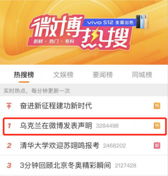 俄罗斯总统普京21日晚签署命令,承认乌克兰东部的“顿涅茨克人民共和国”和“卢甘斯克人民共和国”。北京时间22日,乌克兰驻华大使馆、法国驻华大使馆、俄罗斯驻华大使馆、英国驻华使馆和美国驻华大使馆先后在微博上以中文发布声明。其中,“乌克兰在微博发声明”一度冲上微博热搜第一。