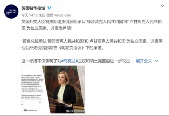 22日14时12分,英国驻华使馆也跟进发微博称,英国外交大臣特拉斯谴责俄罗斯承认“顿涅茨克人民共和国”和“卢甘斯克人民共和国”为独立国家,并发表声明说,这表明俄罗斯决定选择对抗而非对话的道路。我们将与盟国协作,商讨我们亟需做出的反应。我们不会允许俄罗斯违反其国际承诺的行径继续下去。