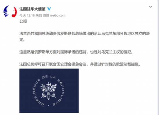 之后不久,22日12时18分,法国驻华大使馆发布公报称,法兰西共和国总统谴责俄罗斯联邦总统做出的承认乌克兰东部分裂地区独立的决定。