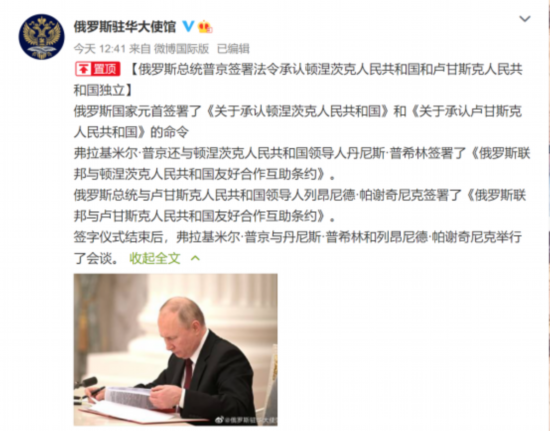 随后,22日12时41分,俄罗斯驻华大使馆发微博称,俄罗斯总统普京签署法令承认顿涅茨克人民共和国和卢甘斯克人民共和国独立。