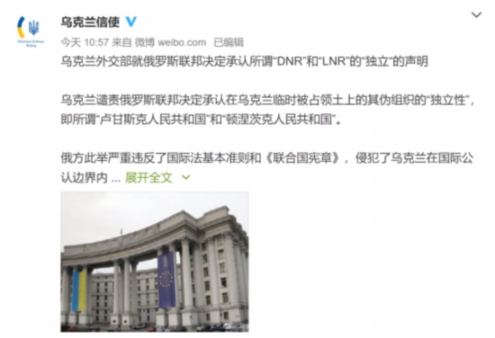 最早发出声明的是乌克兰方面。22日上午10时57分,乌克兰驻华大使馆信息中心官方微博@乌克兰信使发布“乌克兰外交部就俄罗斯联邦决定承认所谓‘DNR’和‘LNR’的‘独立’的声明”。