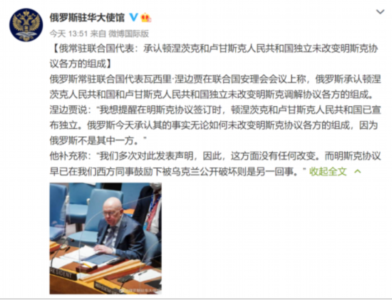 1小时10分钟后,俄罗斯驻华大使馆微博又发布俄罗斯常驻联合国代表瓦西里·涅边贾在联合国安理会会议上的发言,表示俄罗斯承认顿涅茨克人民共和国和卢甘斯克人民共和国独立未改变明斯克调解协议各方的组成。