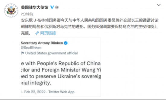 22日15时37分,美国驻华大使馆也发布了一条关于美国务卿布林肯与中国国务委员兼外交部长王毅通电话,讨论乌克兰和朝鲜半岛局势的微博。
