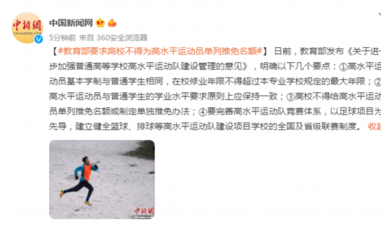 日前,教育部发布《关于进一步加强普通高等学校高水平运动队建设管理的意见》,明确以下几个要点:①高水平运动员基本学制与普通学生相同,在校修业年限不得超过本专业学校规定的最大年限;②高水平运动员与普通学生的学业水平要求原则上应保持一致;③高校不得给高水平运动员单列推免名额或制定单独推免办法;④要完善高水平运动队竞赛体系,以足球项目为先导,建立健全篮球、排球等高水平运动队建设项目学校的全国及省级联赛制度。