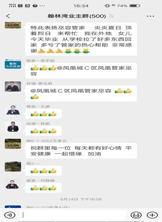2021年6月,炎炎夏日,翰林湾6幢3002室业主女儿毕业回到凤凰城,结果家里都没人,业主女儿又拖了很多行李,拖拉拉也不负责搬上楼,巫容知道后,立马和业主女儿取得了联系,巫管家赶忙去地库等着业主女儿,帮她清点好了行李,一起搬上了楼,并嘱咐业主女儿把门锁好,业主知道后非常感谢,为能有这样贴心的管家而感动舒心,并在业主群表扬了热心的巫管家。