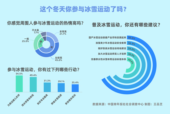 中国青年报社社会调查中心联合问卷网(wenjuan.com),对1212名受访者进行的一项调查显示,67.3%的受访者感觉周围人参与冰雪运动的热情高。普及冰雪运动,56.6%的受访者期待国产冰雪运动装备产业尽快发展起来,让普通人消费得起,56.3%的受访者建议加强青少年冰雪运动安全教育,防止意外。