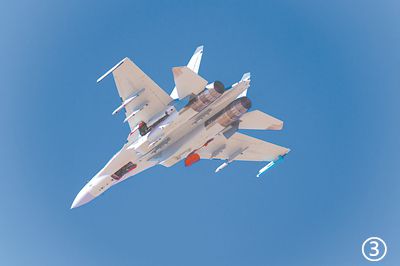 蓝方编队在首战失利后,及时调整战术,采取前后夹击方式再度发起攻势。红方长机沉着应对,释放干扰弹摆脱险境后,迅速调整姿态与僚机协同对“敌”实施反击。