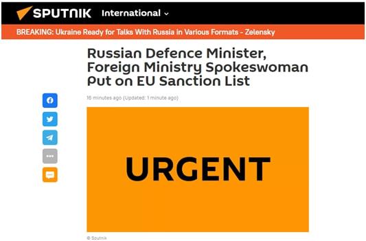 【环球网快讯】俄罗斯卫星通讯社刚刚消息,欧盟已批准对俄罗斯国防部长谢尔盖·绍伊古、俄罗斯外交部信息与出版司司长玛丽亚·扎哈罗娃、“今日俄罗斯”(RT)总编辑玛格丽塔·西蒙扬等555名个人和52家实体实施制裁。