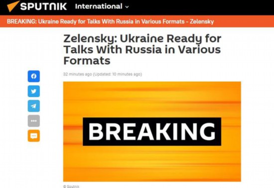 报道称,泽连斯基在Telegram上发布的一段视频中同时使用乌克兰语和俄语发表讲话,他声称俄罗斯已经批准了对乌“进攻”;他还坚称,乌克兰现在没有,将来也不会对俄罗斯构成威胁,乌克兰不希望与莫斯科发生任何类型的战争,包括冷战、“热战”或混合战争。