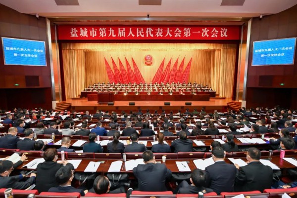 上午9时许,盐城市第九届人民代表大会第一次会议开幕。全体起立,奏唱国歌。