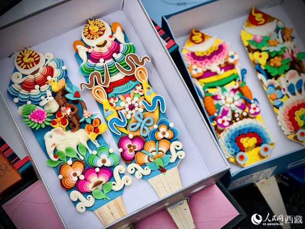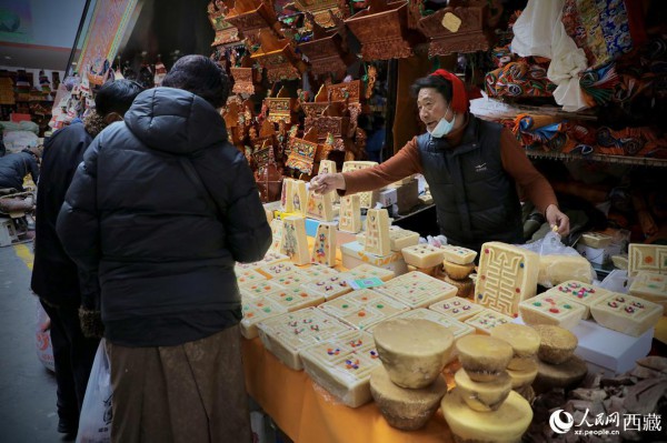 年货市场上的切玛盒。(切玛盒是藏历新年吉祥物,是在精制斗型木盒中用隔板分开,分别盛入炒麦粒和糌粑,插上“仔卓”,象征着人寿年丰、吉祥如意。)人民网 次仁罗布摄