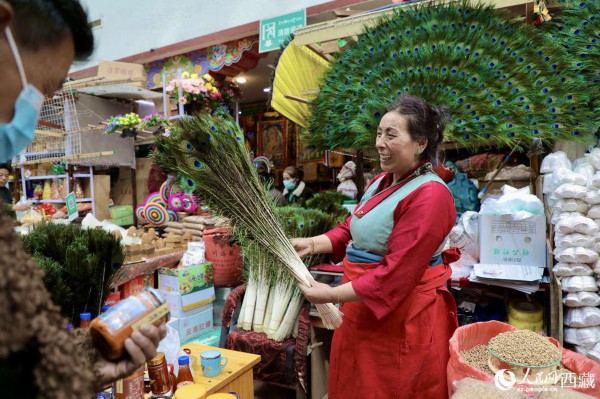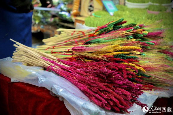 八廓商城一角售卖的 “罗萨美朵”。(每年的藏历新年,家家户户的切玛盒里都要插上 “罗萨美朵”,代表着温馨的家庭里有着幸福的祝愿,承载着欢乐的故土上,能够五谷丰登的期盼。)人民网 次仁罗布摄