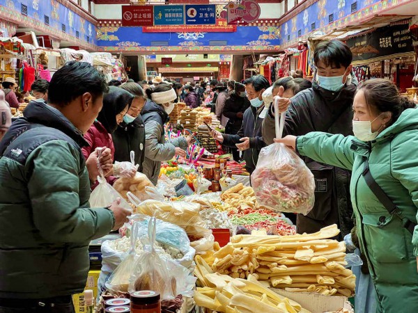 冲赛康市场、八廓商城、拉萨市区各大小超市热闹非凡、人头攒动,处处都是为了采购藏历新年年货乐此不疲的居民群众,耳边尽是熟悉的吆喝声,到处都是欢乐与喜庆。
