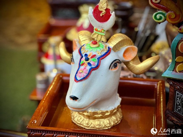 年货市场上售卖的“隆果”。(在藏语中,“隆果” 是羊头的意思,也是新年的谐音。它一般摆放在所有供品的中央,因为人们认为“羊”是吉祥之物,同时也祈盼五谷丰登,六畜兴旺。)人民网 次仁罗布摄