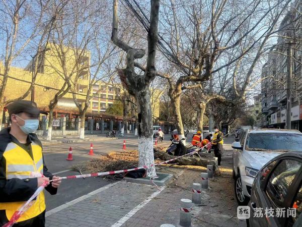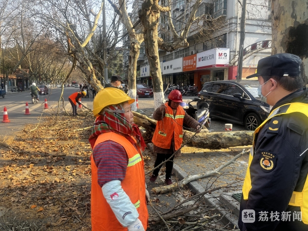 2月23日,位于江北新区大厂街道扬村路路旁的一棵梧桐树突然断裂,直接倒伏在马路上,这一幕正好被正在巡查路过的执法队员遇见了。