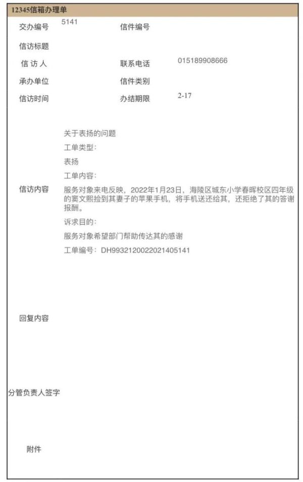 记者从学校看到了这份投诉办理单。原来,四年级的窦文熙同学捡到一个苹果手机,在归还失主后,还拒绝了答谢报酬。于是,失主“投诉”到12345,希望帮助传达谢意。