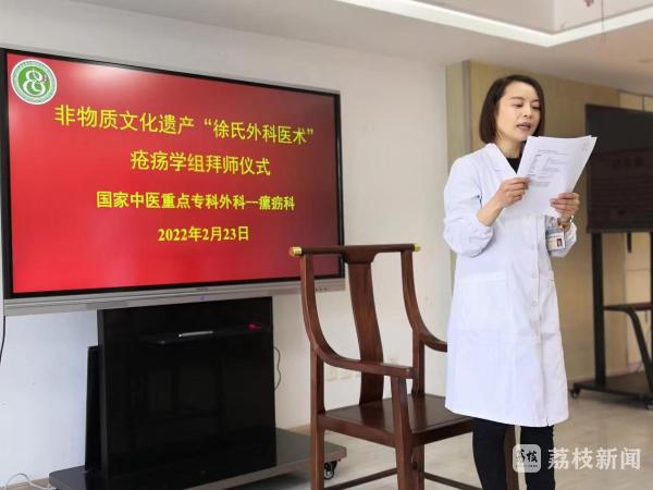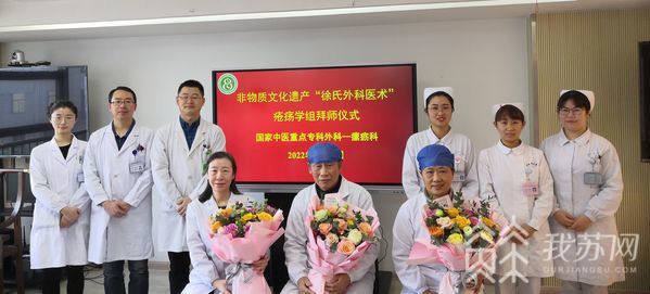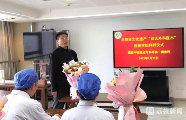 敬拜师茶、行拜师礼、接受师傅所赠中医经典书简、向师傅献花……2月23日,南京市中西医结合医院国家中医重点专科外科(瘰疬科)疮疡学组师带徒拜师仪式举行。六名青年中医骨干分别向该科南京市名中医夏公旭,江苏省名中医钮晓红、中医外科护理专家鲍新建等三位专家拜师,让非物质文化遗产“徐氏外科医术”薪火传承。