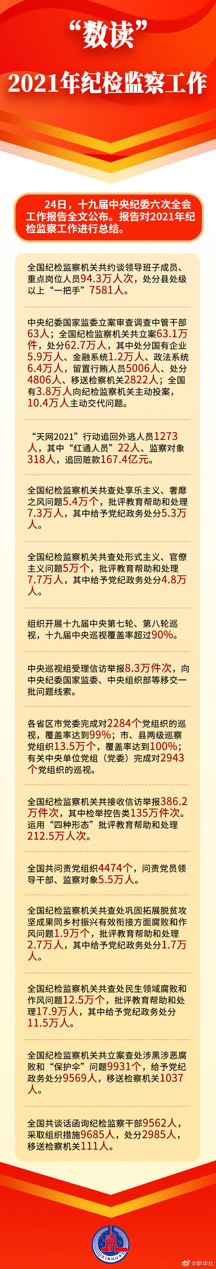 24日,十九届中央纪委六次全会工作报告全文公布。报告对过去一年纪检监察工作进行总结。2021年纪检监察工作有哪些亮点?请戳大图↓