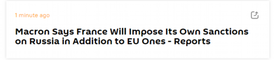 俄罗斯卫星通讯社刚刚消息,法国总统马克龙称,除了欧盟制裁外,法国还将单独对俄罗斯实施制裁。