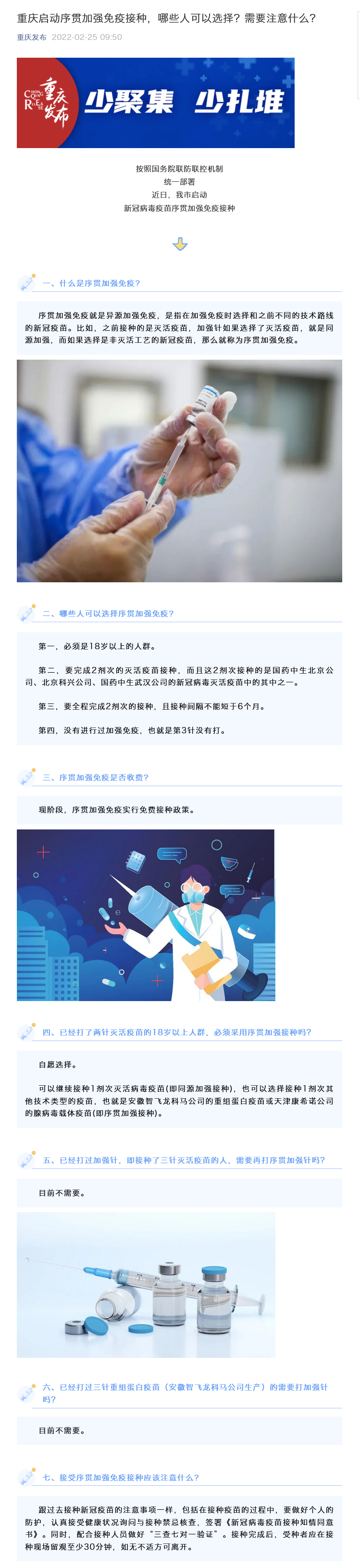 荔枝新闻讯 据重庆发布微信公众号消息,按照国务院联防联控机制统一部署,重庆市近日启动新冠病毒疫苗序贯加强免疫接种。