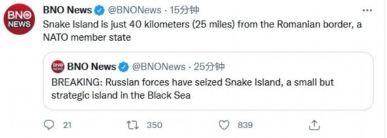 据荷兰媒体BNO News报道,俄罗斯军队占领了黑海一个具有战略意义的小岛——蛇岛(Snake Island)。报道称,该岛距离北约成员国罗马尼亚边境只有40公里。